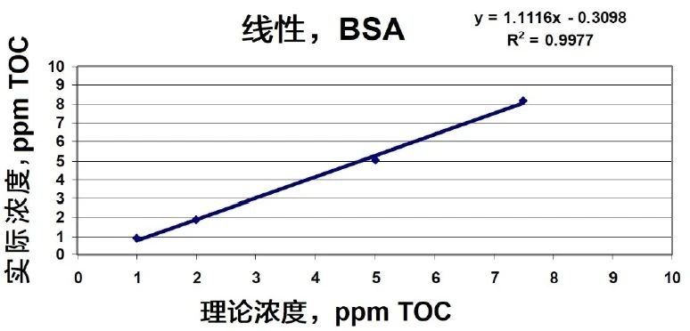 TOC是FDA認可的一種方法①,用于評估所給樣品中所有含碳的化合物,以確保所有設備的清潔都符合所建立的清潔標準。TOC分析允許開發一種方法,用于檢測由化合物、分析物或殘留物通過直接(擦拭)或間接(沖洗)取樣而形成的碳濃度。潛在目標殘留物包括藥物活性成分(API)、藥品賦形劑、蛋白質、蛋白質副產品和清潔劑或成分。1996年,國際協調會議(ICH)在FDA(CDER & CBER②)的協助下,創建了指導文件《Q2B:分析步驟的驗證》。該文檔的目的是為制藥公司如何考慮清潔驗證分析程序的各種驗證特征提供參考。本文提供了與下列參數相關的多個實例,這些實例均與TOC方法驗證有關,因而此應用說明呼應了Q2B指導文件:檢出限(LOD)用于評估何時信號是儀器噪音的結果還是化合物的反應。LOD被視為樣本中分析物的最低檢測量,但沒有必要的足夠的統計確定性來定量。定量限(LOQ)是對數據有意義還是無意義提供指導而建立的值。低于LOQ的儀器反應表示存在有機物,但無法定量實際濃度。分析儀中的讀數高于已建立的LOQ則被視為可定量或有意義的數據。為了確定背景TOC的濃度并推導出用于清潔驗證方案的LOD和LOQ,必須準備低TOC的水空白或棉簽空白(如果適用)來計算實驗中水和小瓶的碳成分。一旦已經從這些樣本中確定了標準偏差,則通常是將標準偏差分別乘以3和10來獲得LOD和LOQ④。了解TOC分析方法驗證中準確度和精確度的區別非常重要。準確度與測得值和分析物的真實值的接近程度相關。通常,準確度是計算儀器驗證時測得的標準品的TOC濃度與預期的標準品TOC濃度的差值百分比(即+7%)所得。精確度通過標準偏差或RSD(相對標準偏差)度量。精確度與所給樣本的多個分析結果相互之間的接近程度相關。在TOC方法驗證期間,通過分析加了(添加)已知濃度的目標殘留物的樣品可以測定準確度和精確度,并可以評定差值百分比和RSD。ICH文件推薦至少在三個濃度級別上至少進行九次測定來評估準確度和精確度,這三個濃度級別涵蓋了儀器的指定范圍⑤。通常,線性測試校驗儀器反應值是否與所研究分析物的濃度具有線性關系。圖1演示了TOC濃度范圍從1.00 ppm到7.50 ppm,牛血清白蛋白(BSA)的線性關系,其中含低TOC水的小瓶中加了已知濃度的BSA。這個例子演示了理論濃度(x軸)對所測得的濃度(y軸)作圖所得到的兩者之間的線性關系,y=(m)x+b。分析儀的反應值與所研究化合物的相關系數(R2)應大于0.97。圖1. 數據使用Sievers實驗室TOC分析儀獲得