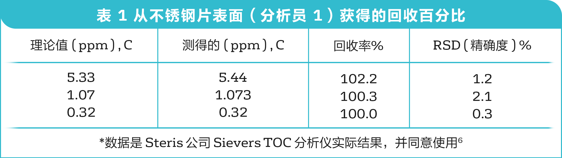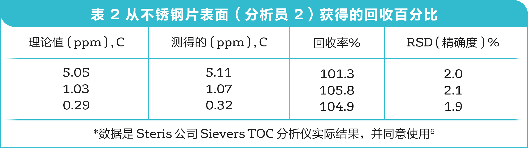 為了確定TOC方法用于分析目標殘留物的適用性,有必要確定分析方法可達到的回收率。以下例子使用CIP-100制備已知TOC度的溶液,并將已知量的樣本放到不銹鋼片上,演示了直接取樣方法。在BSA的例子中,在不銹鋼片上添加三個遞增濃度的CIP-100清潔液,擦拭不銹鋼片,然后將此棉簽放到已知量的低TOC水中。表1提供了從不銹鋼片表面獲得的回收百分比結果。與實際回收率同樣重要的是,用于確定所研究化合物回收百分比的TOC分析方法的重現性或穩健性。在清潔驗證方法開發中穩固性是指結果不受方法中參數、或樣本之間的小而微妙的變化的影響的能力。還提供了正常使用期間的可靠性指示(例如各個分析員的取樣方法)。若希望得到高回收率,回收率一直保持可重復性也同等重要或更為重要,并在整個方法開發期間一直需要對回收率進行檢測。表1和表2提供了CIP-100棉簽回收率分析信息,由兩個不同的分析員測試樣本間的變化。