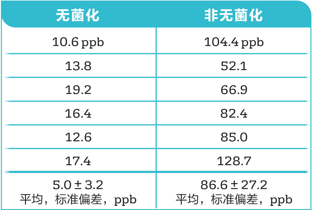 目的美國藥典USP 23要求,對于純化水(PW)和注射用水(WFI),應使用總有機碳(TOC)含量測定替代易氧化物測試。為支持使用自動進樣器在實驗室檢測TOC,最小化并去除來自樣品瓶及樣品準備過程的背景碳,非常關鍵。本文設計用于協助制藥公司遵循水質量的建議規格,并檢驗了幾種不同的樣品瓶和玻璃器皿清洗方法。在樣品瓶中進行總碳分析時,背景污染可有多種不同的來源。最大的潛在背景碳含量來源之一,可以直接來自用于樣品瓶漂洗和樣品制備的水源。為了進行此測定,可使用Sievers?在線TOC分析儀直接檢測水源中的總有機碳(TOC)含量。如果水源是商品瓶裝水,則應從容器直接取樣進行該分析。如果水源為實驗室水系統,充注1升干凈的玻璃燒瓶并從該燒瓶取樣進行分析。表1顯示了使用這些技術在Sievers分析儀上檢測得到的結果。當水轉移到燒瓶和樣品瓶內時很容易被污染,正如以上所示,Sievers分析儀檢測結果顯示,水轉移到燒瓶中的TOC含量更高。如果可能的話,檢驗所選水源類型,以顯示其具有穩定的低TOC。污染的第二個主要來源可來自樣品瓶和清洗步驟。為了測定TOC背景污染的初始程度,請使用強烈的清洗步驟。在科學界廣泛使用的清洗實驗室玻璃器皿的方法是鉻酸溶液(Sievers分析儀技術方案914-80005),已經被從美國藥典的實驗室玻璃器皿清洗<1051>章中去除。使用該步驟清洗的樣品瓶和其他玻璃器皿將獲得較低的TOC背景污染。在獲得較低的背景污染之后,需要慎重檢驗更溫和的清洗步驟以獲得同樣的結果。這里所檢驗的腐蝕性最小的化學清洗步驟是CIP-100洗滌劑。作為清洗劑的替代方案,可使用馬弗爐清洗玻璃器皿。馬弗爐工藝需要的人工更少,但初始設備成本巨大。如表2所示,硫酸清洗、馬弗爐和CIP-100洗滌劑清洗過程與鉻酸清洗過程的結果相當。CIP-100洗滌劑的一個優點是只需要10次漂洗,而與之相比,其他清洗劑需要15或20次漂洗。Alconox實驗室洗滌劑不建議作為低TOC工作的清洗劑。當表2中所使用的樣品瓶,加入足夠的苯醇醚(Octoxynol)(Triton X-100),形成當充滿去離子水時50 ppm(以碳計)的溶液,這時的清洗是有挑戰性的。使這些標準添加溶液在各樣品瓶中干燥,然后進行各種清洗步驟。當細菌污染成為問題時,微生物群落存在類似的情況。在這里開發了無菌化技術,以應對微生物工作中遇到的交叉污染問題。此概念可部分適用于碳樣品的制備。例如,適合碳樣品制備的無菌化概念為:避免直接觸摸墊片、移液管、自動進樣器針和其他與樣品直接接觸的設備;避免采集前幾毫升的樣品流,采集樣品前等待,直到一些液體經過并凈化管道;當將樣品瓶載入自動進樣器時避免接觸覆蓋樣品瓶的隔膜。第二種意見是僅使用新樣品瓶進行TOC分析。這種做法費錢費力,因為這些新樣品瓶需要進行15次漂洗的準備步驟。使用此方法獲得的TOC值列在表3中。而另一種方法是購買制造商預清洗的樣品瓶。然而此處列出的樣品瓶,供應商沒有直接檢測其TOC,而是檢測其揮發性有機化合物。因此,沒有保證其最大TOC含量。這些預清洗的樣品瓶充注Sievers低有機物去離子水,并在儀器上進行分析。結果如表4所示。表3 新試管的漂洗與測試