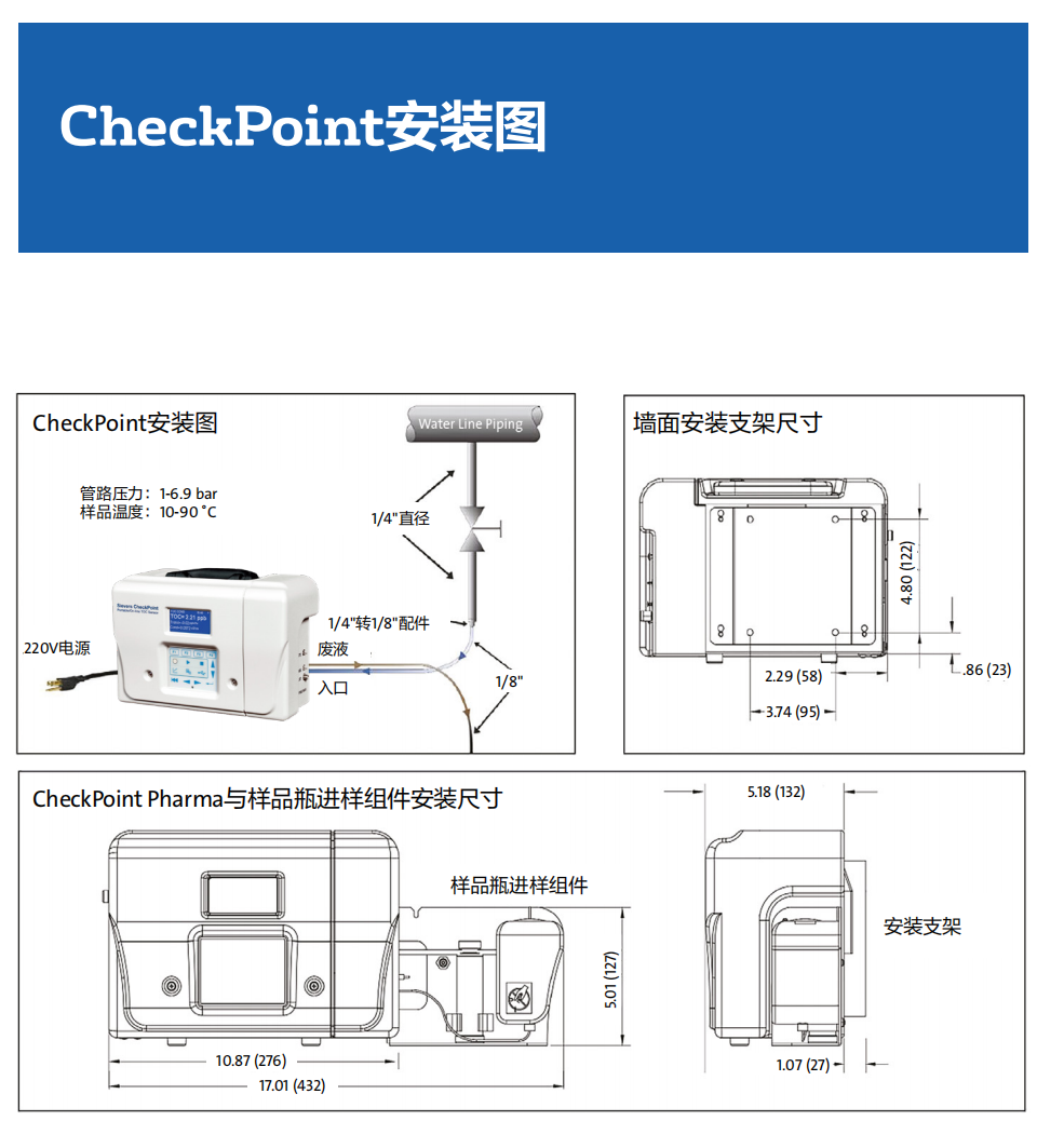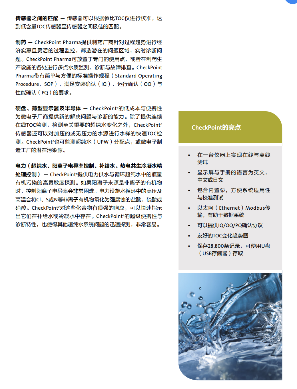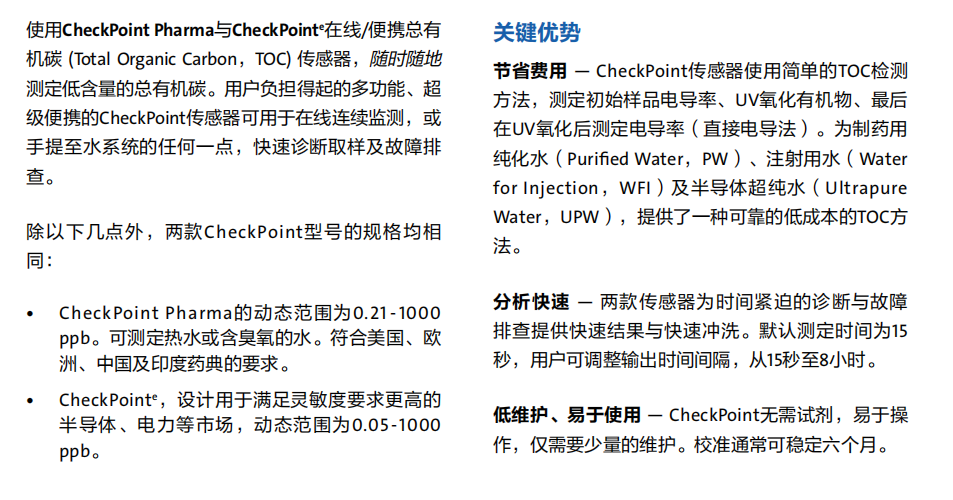 使用 Checkpoint" Pharma與 Checkpoint°在線和便攜總有機堿( Total Organic Carbon,TOC傳感器,隨時隨地測定低含暈的總有機破。用戶負擔得起的多功能、超級便攜的 Checkpoint傳景器可用于在線連續臨測,或手提至水系統的任何一點,快速診斷取樣及故障排查。