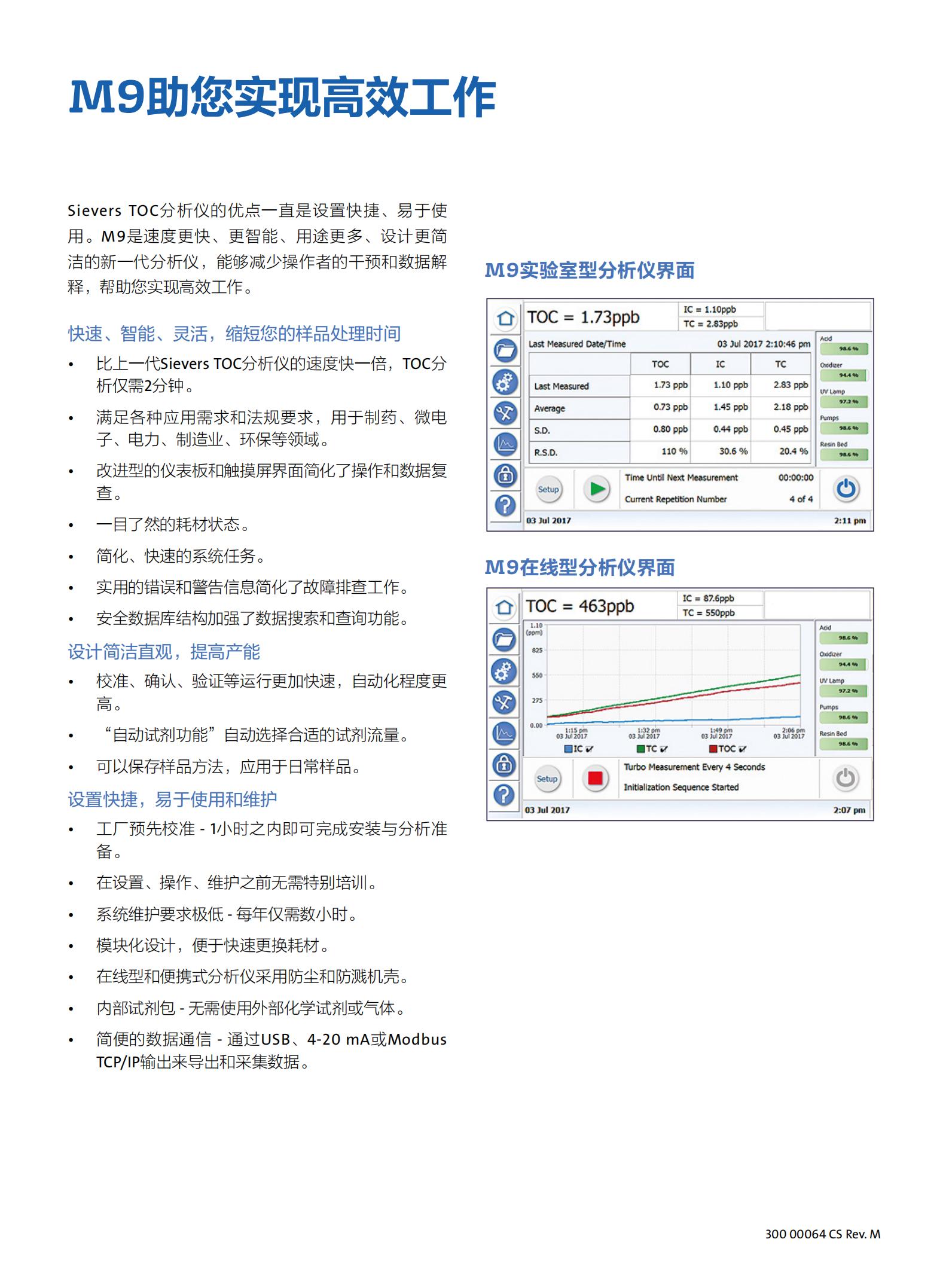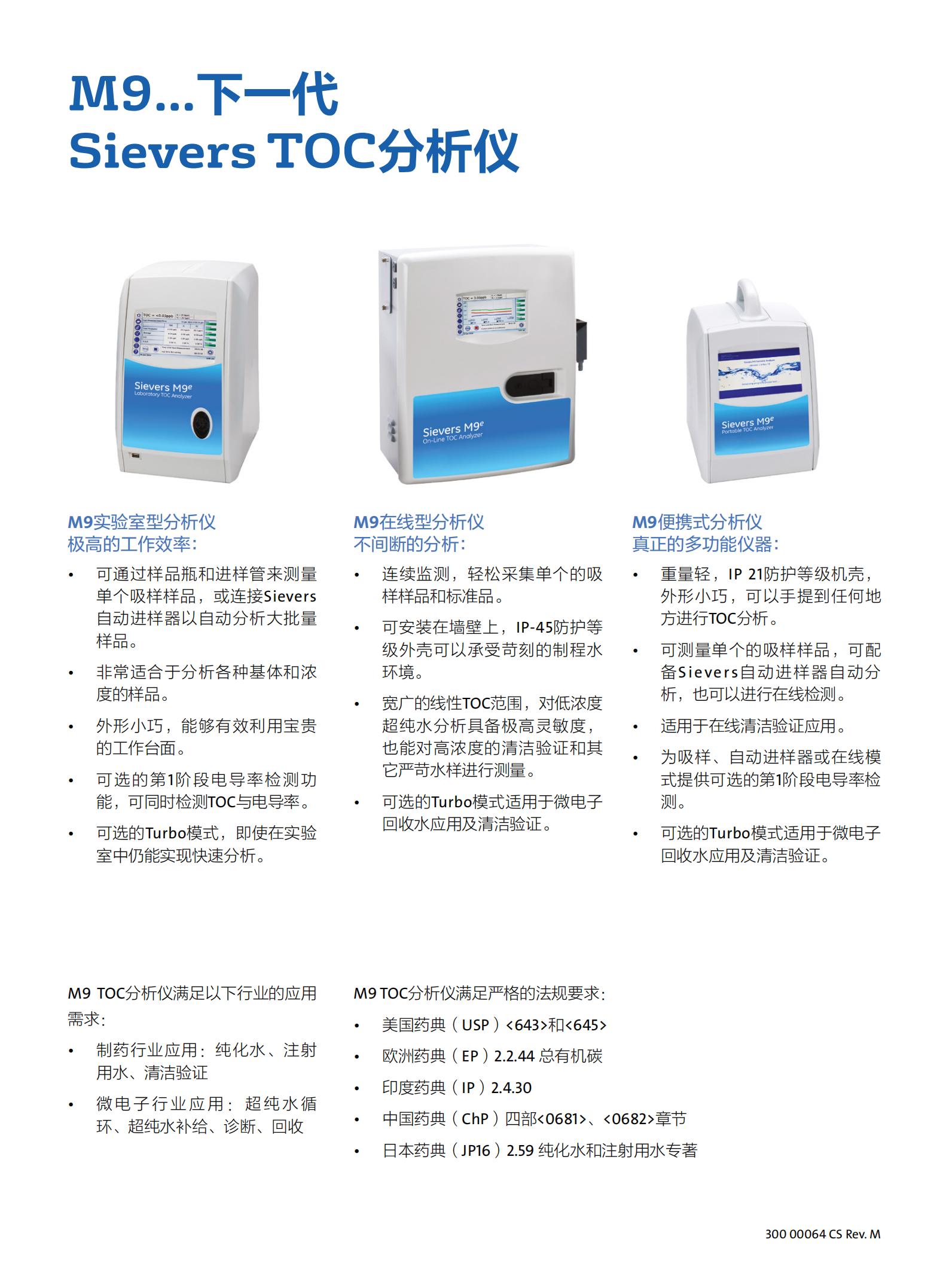 Sievers TOC分析儀的優點一直是設置快建、易于使用。M9是速度更快、智能、用途更多、設計簡潔的新一代分析儀,能夠屬少操作者的干預和數據解釋,幫前您實現高效工作。