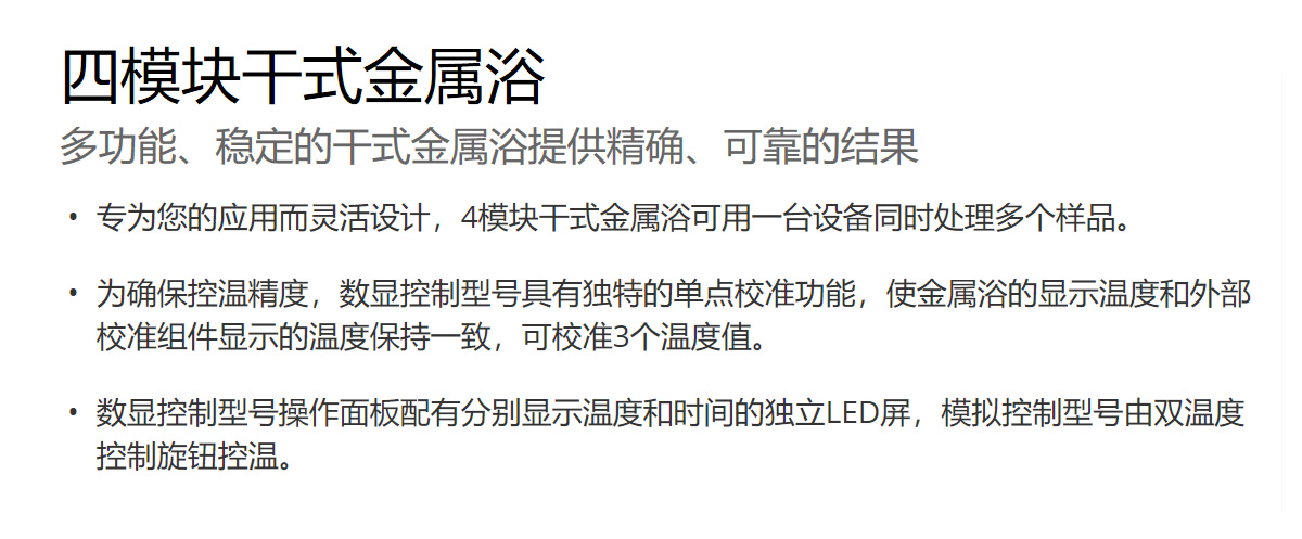 多功能干式金屬浴非常適用于具有溫度穩定性需求的應用。主機可放置4個模塊,共有40多款模塊供選擇,無需工具即可實現更換。試管和孔槽緊密接觸,極大限度提高保暖、加熱效率。數顯型號具有出色的溫度一致性、穩定性及結果可重復性。模擬型號則是經濟的選擇。