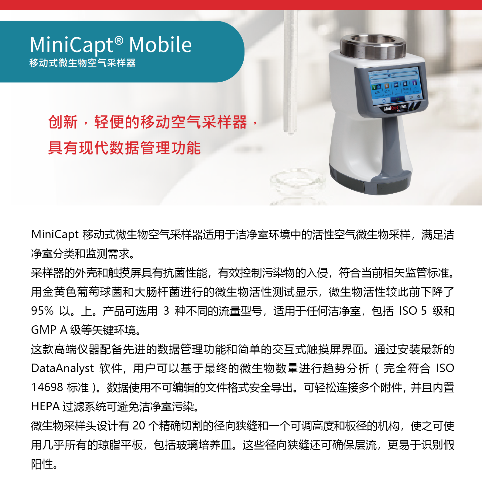 MiniCapt?微生物采樣器是一款創(chuàng)新輕型移動(dòng)式微生物采樣器。它具備現(xiàn)代化的數(shù)據(jù)管理功能,可以簡(jiǎn)化微生物采樣操作,從而節(jié)約時(shí)間,還可以減少人為失誤。MiniCapt?微生物采樣器擁有電容式的觸摸屏,可以戴手套操作而無(wú)需點(diǎn)觸筆。