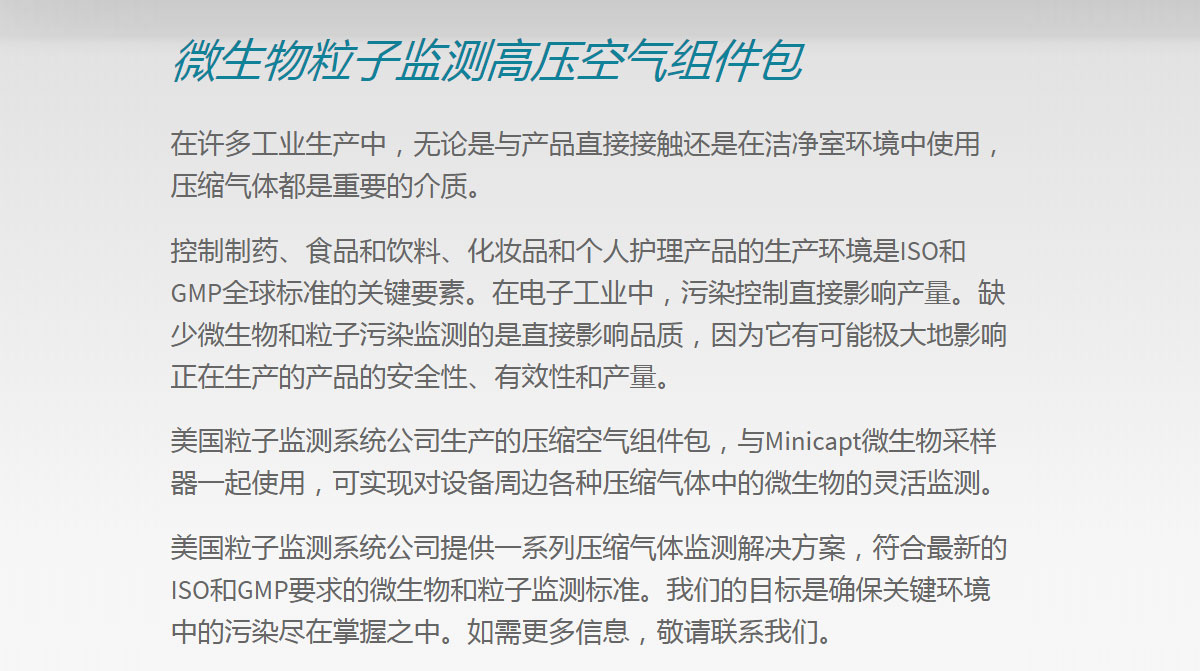 在許多工業生產中,無論是與產品直接接觸還是在潔凈室環境中使用,壓縮氣體都是重要的介質。控制制藥、食品和飲料、化妝品和個人護理產品的生產環境是ISO和GMP全球標準的關鍵要素。在電子工業中,污染控制直接影響產量。缺少微生物和粒子污染監測的是直接影響品質,因為它有可能極大地影響正在生產的產品的安全性、有效性和產量。