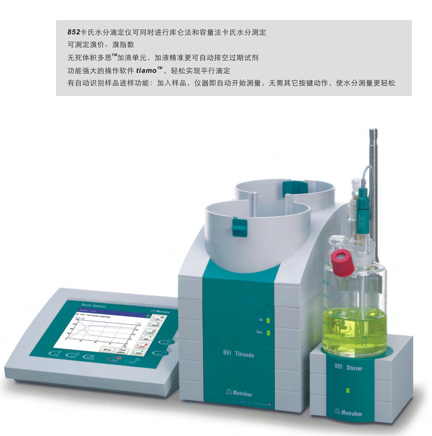 852型庫侖法卡氏水分滴定儀集成了多項瑞士萬通的多項技術,是庫侖法卡氏水分滴定儀的代表作。基于無死體積滴定管和多項智能化技術,是高度自動化、智能化實驗室的明智之選。852兼具庫侖法/容量法兩種卡氏水分滴定方法。當您要分析含水量范圍很寬的樣品時,其水分測定范圍從微克到100%。采用tiamoTM軟件控制,可以同時進行兩種測定。?