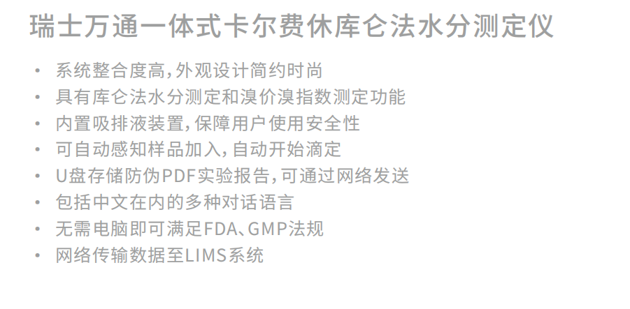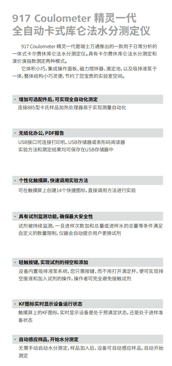 917 Coulomete精靈一代是瑞士萬通推出的一款用于日常分析的一體式卡爾費休庫侖法水分測定儀。具有卡爾費休庫侖法水分測定和溴價溴指數測定兩種模式。它體積小巧,集成了操作面板,磁力攪拌器,滴定池,以及吸排液泵于一體,整體結構小巧靈便,節約了您寶貴的實驗室空間。