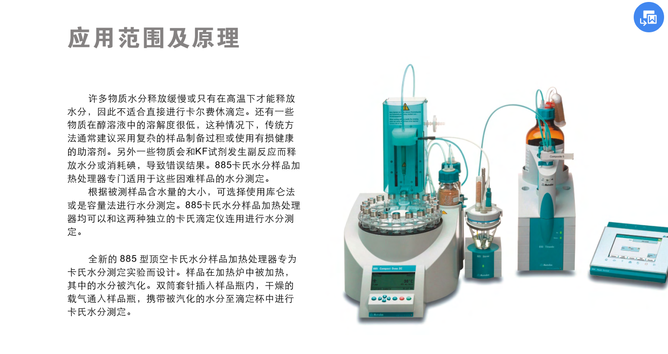 885頂空卡氏水分樣品加熱處理器采用瑞士萬通的頂空卡氏水分加熱技術,配合Metrohm容量法或庫侖法卡氏水分測定儀,實現了全自動樣品轉換和困難樣品分析兩者的結合。