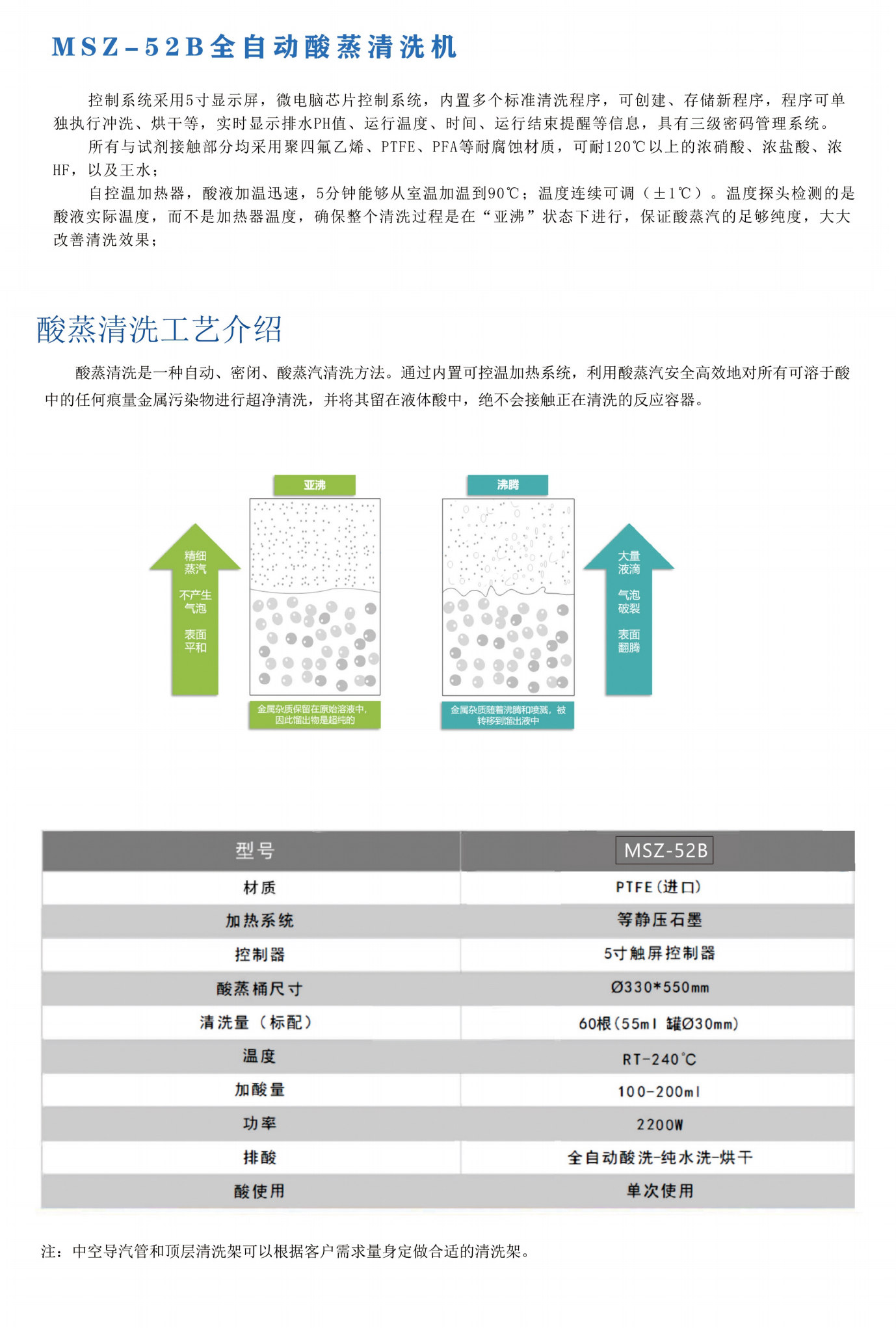 控制系統采用5寸顯示屏,微電腦芯片控制系統,內置多個標準清洗程序,可創建、存儲新程序,程序可單獨執行沖洗、烘干等,實時顯示排水PH值、運行溫度、時間、運行結束提醒等信息,具有三級密碼管理系統。?所有與試劑接觸部分均采用聚四氟乙烯、PTFE、PFA等耐腐蝕材質, 可耐120℃以上的濃硝酸、濃鹽酸、濃HF,以及王水;?自控溫加熱器,酸液加溫迅速,5分鐘能夠從室溫加溫到90℃;溫度連續可調(±1℃)。溫度探頭檢測的是酸液實際溫度,而不是加熱器溫度,確保整個清洗過程是在"亞沸"狀態下進行,保證酸蒸汽的足夠純度,大大改善清洗效果。