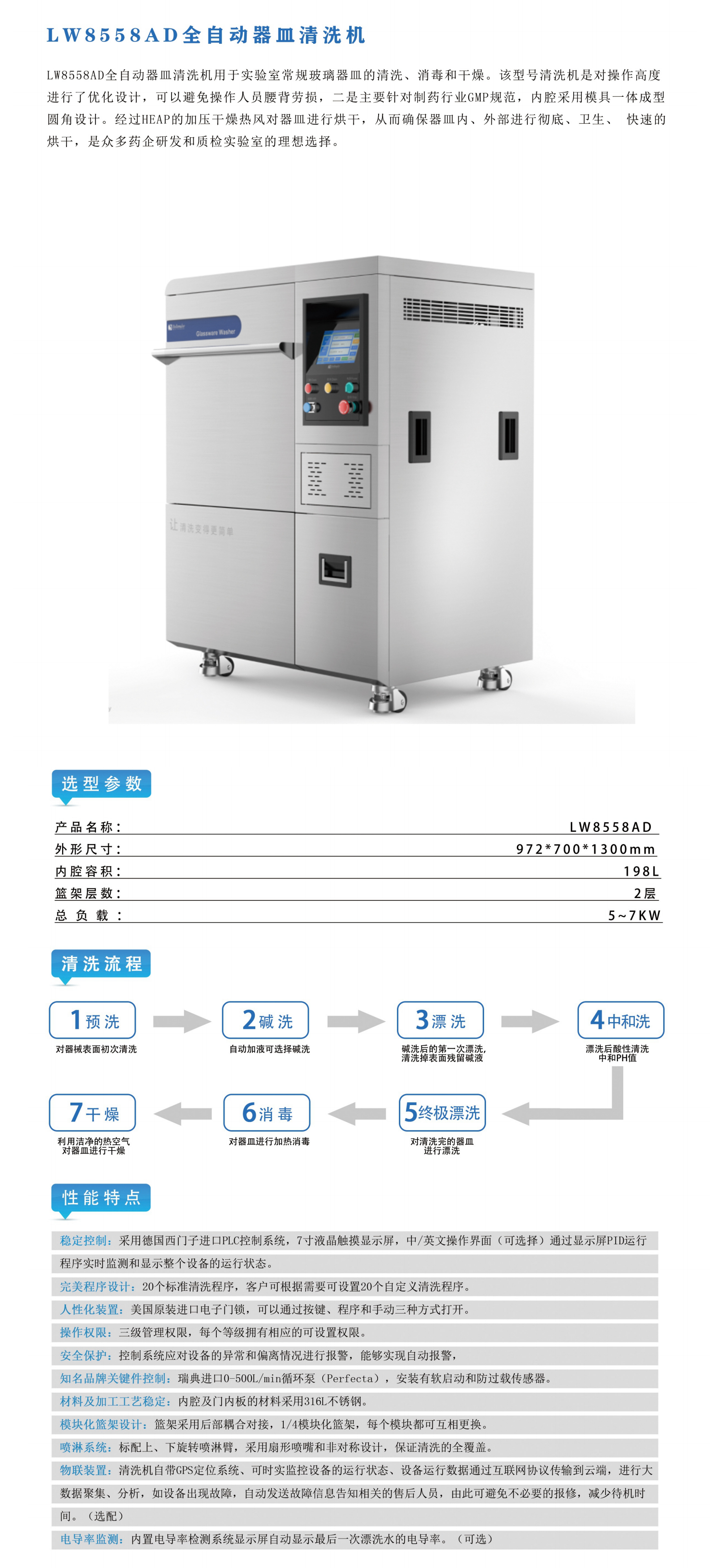 該型號清洗機用于實驗室常規玻璃器皿的清洗、 消毒和干燥。由于對操作高度進行了優化設計, 可以避免操作人員腰背勞損二是主要針對制藥行業GMP規范,內腔采用圓角設計。 經過HEAP的加壓干燥熱風通過噴嘴對消洗之后的器皿 進行烘干,從而確保器皿內、 外部進行徹底、 衛生、 快速的烘干 使其立即處于備用狀態, 是眾多藥企研發和頂檢實驗室經濟實用選擇。