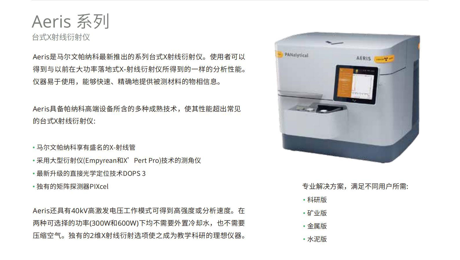 Aeris是馬爾文帕納科最新推出的系列臺式X射線衍射儀。使用者可以得到與以前在大功率落地式X-射線衍射儀所得到的一樣的分析性能。