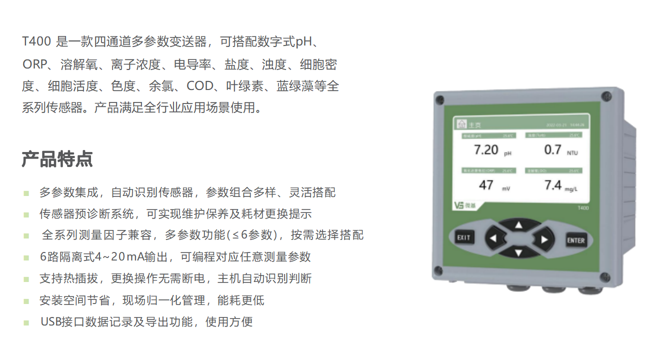 T400 是一款四通道多參數變送器,可搭配數字式pH、ORP、溶解氧、離子濃度、電導率、鹽度、濁度、細胞密 度、細胞活度、色度、余氯、COD、葉綠素、藍綠藻等全系列傳感器。產品滿足全行業應用場景使用。