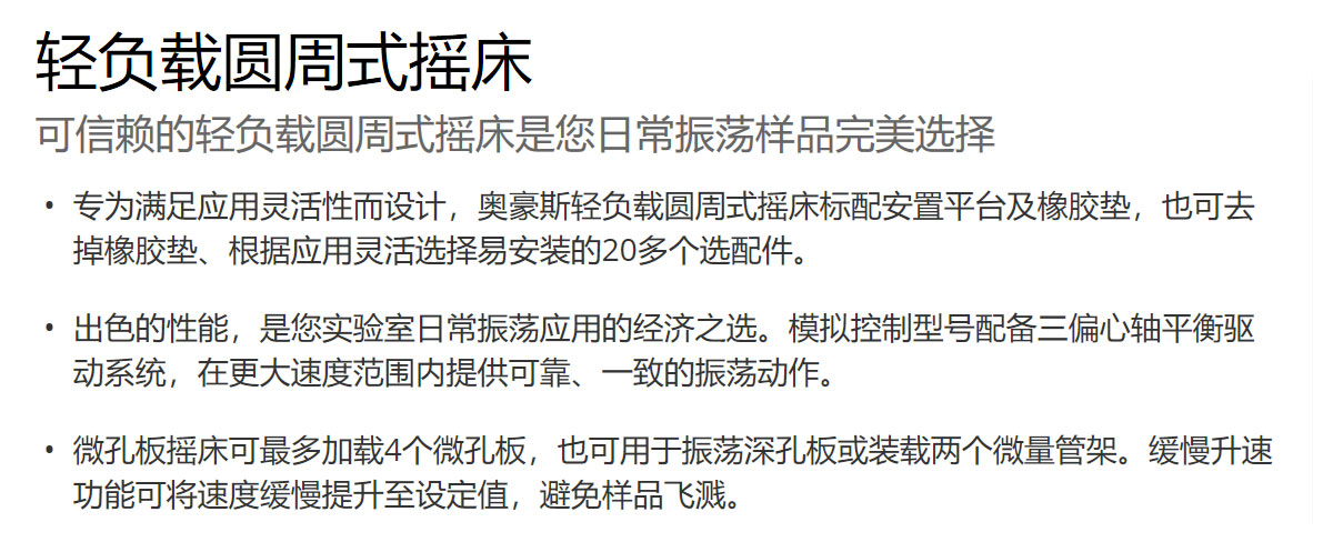 可靠耐用的奧豪斯輕負載搖床,樣品處理量高達3.6kg,根據圓周直徑和速度范圍選型,使您的樣品混合效果進一步優化。數顯控制輕負載搖床專門用于振蕩微孔板,兩種振幅型號可選;模擬控制型號則為經濟之選,滿足日常應用。所有型號配備三偏心軸平衡驅動系統,微處理控制器確保振蕩動作可靠、一致。