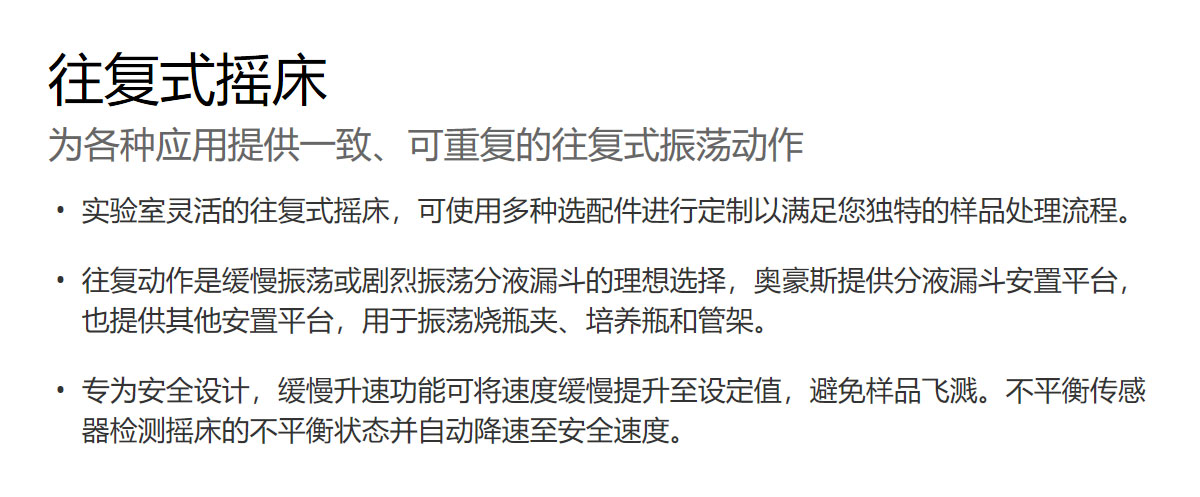 奧豪斯往復式搖床專為需要結果準確、重現性好的各種應用而設計,包括細胞培養和提取等,振蕩動作一致、均勻。振蕩動作行程長度19mm,永久潤滑的滾珠軸承及無需維護的無刷直流電機確保運行可靠、且連續工作。